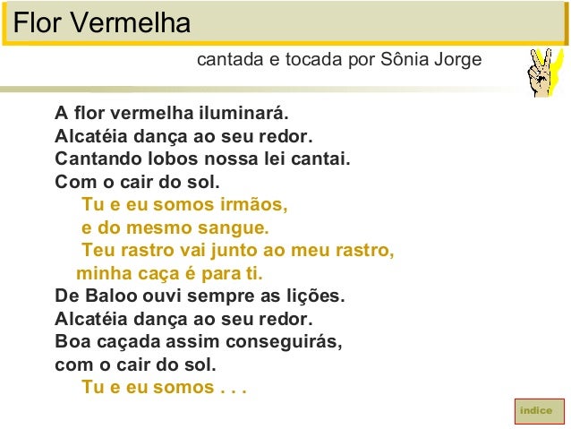 44. 44. Flor VermelhaA flor vermelha iluminará.Alcatéia dança ao seu redor.Cantando lobos nossa lei cantai.Com o cair do sol.Tu e eu somos irmãos,e do mesmo sangue.Teu rastro vai junto ao meu rastro,minha caça é para ti.De Baloo ouvi sempre as lições.Alcatéia dança ao seu redor.Boa caçada assim conseguirás,com o cair do sol.Tu e eu somos . . .cantada e tocada por Sônia Jorgeíndice