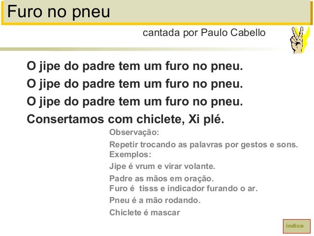 46. 46. Furo no pneuO jipe do padre tem um furo no pneu.O jipe do padre tem um furo no pneu.O jipe do padre tem um furo no pneu.Consertamos com chiclete, Xi plé.cantada por Paulo CabelloíndiceObservação:Repetir trocando as palavras por gestos e sons.Exemplos:Jipe é vrum e virar volante.Padre as mãos em oração.Furo é tisss e indicador furando o ar.Pneu é a mão rodando.Chiclete é mascar
