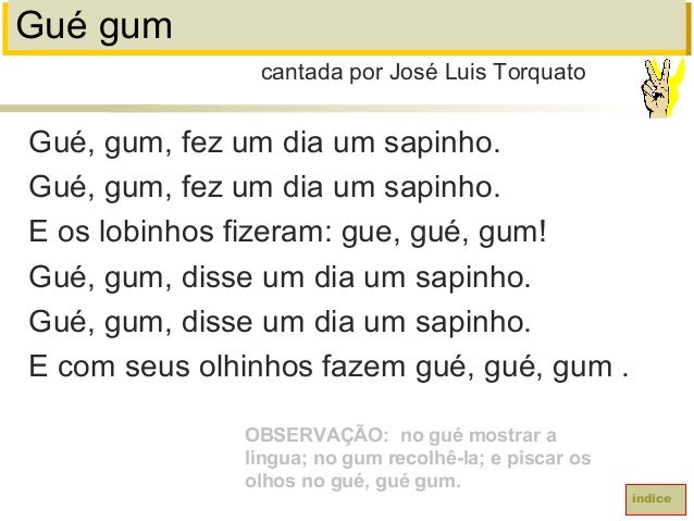 47. 47. Gué gumGué, gum, fez um dia um sapinho.Gué, gum, fez um dia um sapinho.E os lobinhos fizeram: gue, gué, gum!Gué, gum, disse um dia um sapinho.Gué, gum, disse um dia um sapinho.E com seus olhinhos fazem gué, gué, gum .cantada por José Luis TorquatoíndiceOBSERVAÇÃO: no gué mostrar alíngua; no gum recolhê-la; e piscar osolhos no gué, gué gum.