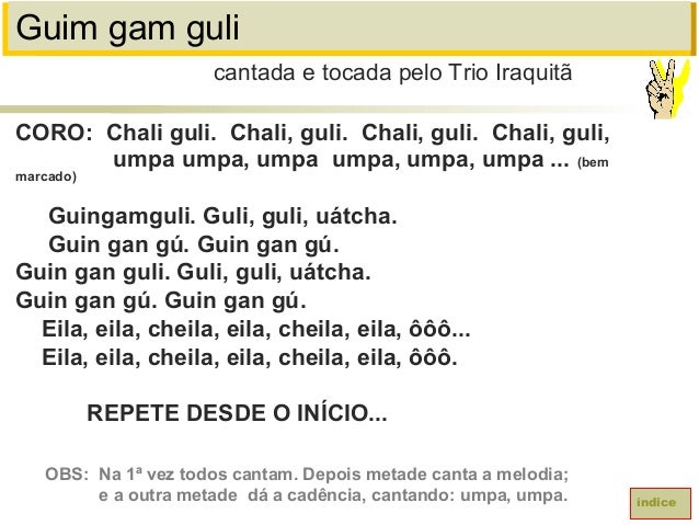 48. 48. Guim gam guliCORO: Chali guli. Chali, guli. Chali, guli. Chali, guli,umpa umpa, umpa umpa, umpa, umpa ... (bemmarcado)Guingamguli. Guli, guli, uátcha.Guin gan gú. Guin gan gú.Guin gan guli. Guli, guli, uátcha.Guin gan gú. Guin gan gú.Eila, eila, cheila, eila, cheila, eila, ôôô...Eila, eila, cheila, eila, cheila, eila, ôôô.REPETE DESDE O INÍCIO...cantada e tocada pelo Trio IraquitãíndiceOBS: Na 1ª vez todos cantam. Depois metade canta a melodia;e a outra metade dá a cadência, cantando: umpa, umpa.