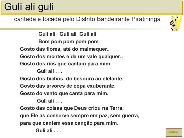 50. 50. Guli ali guliGuli ali Guli ali Guli aliBom pom pom pom pomGosto das flores, até do malmequer..Gosto dos montes e de um vale qualquer..Gosto dos rios que cantam para mimGuli ali . . .Gosto dos bichos, do besouro ao elefante.Gosto das árvores de copa exuberante.Gosto do vento que canta para mim.Guli ali . . .Gosto das coisas que Deus criou na Terra,que Ele as conserve sempre em paz, sem guerra,para que cantem essa canção para mim.Guli ali . . . índicecantada e tocada pelo Distrito Bandeirante Piratininga