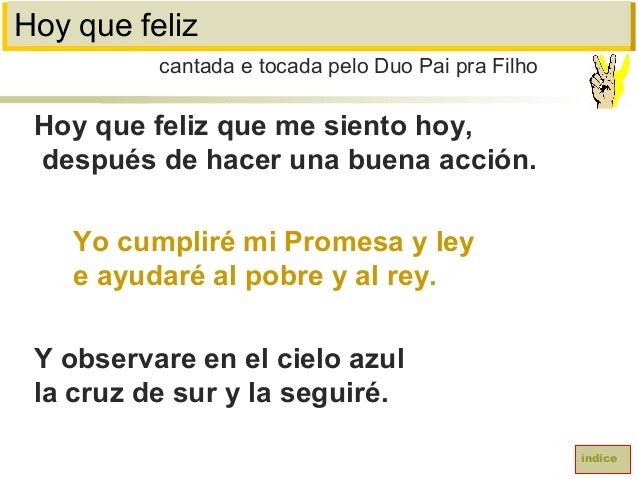 53. 53. Hoy que felizHoy que feliz que me siento hoy,después de hacer una buena acción.Yo cumpliré mi Promesa y leye ayudaré al pobre y al rey.Y observare en el cielo azulla cruz de sur y la seguiré.cantada e tocada pelo Duo Pai pra Filhoíndice