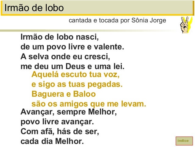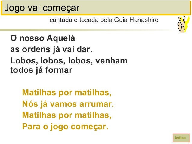 56. 56. Jogo vai começarO nosso Aqueláas ordens já vai dar.Lobos, lobos, lobos, venhamtodos já formarMatilhas por matilhas,Nós já vamos arrumar.Matilhas por matilhas,Para o jogo começar.cantada e tocada pela Guia Hanashiroíndice