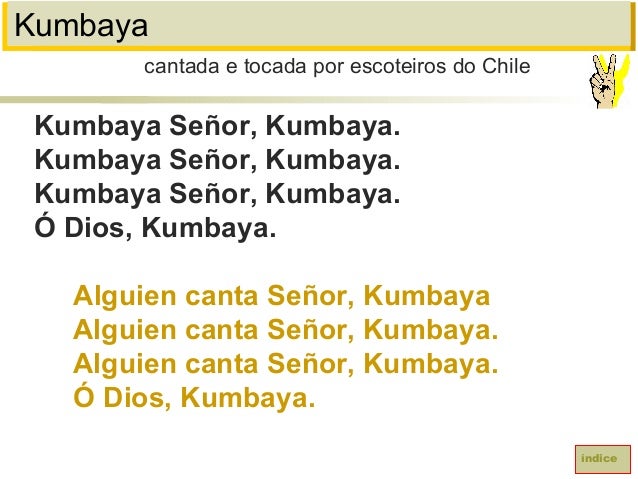 58. 58. KumbayaKumbaya Señor, Kumbaya.Kumbaya Señor, Kumbaya.Kumbaya Señor, Kumbaya.Ó Dios, Kumbaya.Alguien canta Señor, KumbayaAlguien canta Señor, Kumbaya.Alguien canta Señor, Kumbaya.Ó Dios, Kumbaya.cantada e tocada por escoteiros do Chileíndice