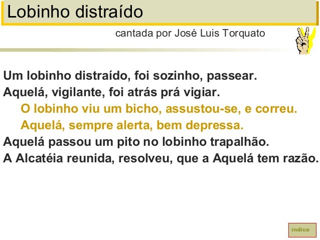 60. 60. Lobinho distraídoUm lobinho distraído, foi sozinho, passear.Aquelá, vigilante, foi atrás prá vigiar.O lobinho viu um bicho, assustou-se, e correu.Aquelá, sempre alerta, bem depressa.Aquelá passou um pito no lobinho trapalhão.A Alcatéia reunida, resolveu, que a Aquelá tem razão.cantada por José Luis Torquatoíndice