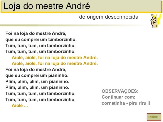 61. 61. Loja do mestre AndréFoi na loja do mestre André,que eu comprei um tamborzinho.Tum, tum, tum, um tamborzinho.Tum, tum, tum, um tamborzinho.Aiolé, aiolé, foi na loja do mestre André.Aiolé, aiolé, foi na loja do mestre André.Foi na loja do mestre André,que eu comprei um pianinho.Plim, plim, plim, um pianinho.Plim, plim, plim, um pianinho.Tum, tum, tum, um tamborzinho.Tum, tum, tum, um tamborzinho.Aiolé ...de origem desconhecidaíndiceOBSERVAÇÕES:Continuar com:cornetinha - piru riru li