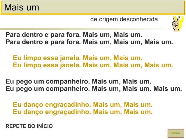 64. 64. Mais umPara dentro e para fora. Mais um, Mais um.Para dentro e para fora. Mais um, Mais um, Mais um.Eu limpo essa janela. Mais um, Mais um.Eu limpo essa janela. Mais um, Mais um, Mais um.Eu pego um companheiro. Mais um, Mais um.Eu pego um companheiro. Mais um, Mais um. Mais um.Eu danço engraçadinho. Mais um, Mais um.Eu danço engraçadinho. Mais um, Mais um.REPETE DO INÍCIOde origem desconhecidaíndice