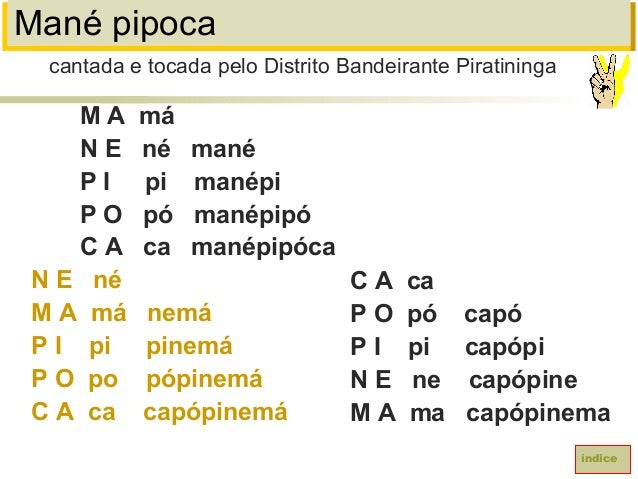 65. 65. Mané pipocaM A máN E né manéP I pi manépiP O pó manépipóC A ca manépipócaN E néM A má nemáP I pi pinemáP O po pópinemáC A ca capópinemáíndiceC A caP O pó capóP I pi capópiN E ne capópineM A ma capópinemacantada e tocada pelo Distrito Bandeirante Piratininga