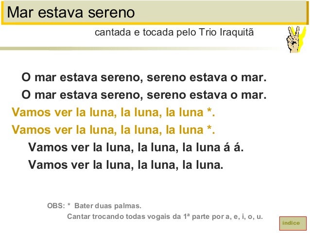 66. 66. Mar estava serenoO mar estava sereno, sereno estava o mar.O mar estava sereno, sereno estava o mar.Vamos ver la luna, la luna, la luna *.Vamos ver la luna, la luna, la luna *.Vamos ver la luna, la luna, la luna á á.Vamos ver la luna, la luna, la luna.cantada e tocada pelo Trio IraquitãíndiceOBS: * Bater duas palmas.Cantar trocando todas vogais da 1ª parte por a, e, i, o, u.
