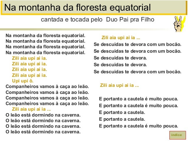 68. 68. Na montanha da floresta equatorialNa montanha da floresta equatorial.Na montanha da floresta equatorial.Na montanha da floresta equatorial.Na montanha da floresta equatorial.Zili aia upi ai ia.Zili aia upi ai ia.Zili aia upi ai ia.Zili aia upi ai ia.Upi upi ô.Companheiros vamos à caça ao leão.Companheiros vamos à caça ao leão.Companheiros vamos à caça ao leão.Companheiros vamos à caça ao leão.Zili aia upi ai ia ...O leão está dormindo na caverna.O leão está dormindo na caverna.O leão está dormindo na caverna.O leão está dormindo na caverna.cantada e tocada pelo Duo Pai pra FilhoíndiceZili aia upi ai ia ...Se descuidas te devora com um bocão.Se descuidas te devora com um bocão.Se descuidas te devora.Se descuidas te devora.Se descuidas te devora com um bocão.Zili aia upi ai ia ...E portanto a cautela é muito pouca.E portanto a cautela é muito pouca.E portanto a cautela.E portanto a cautela.E portanto a cautela é muito pouca.