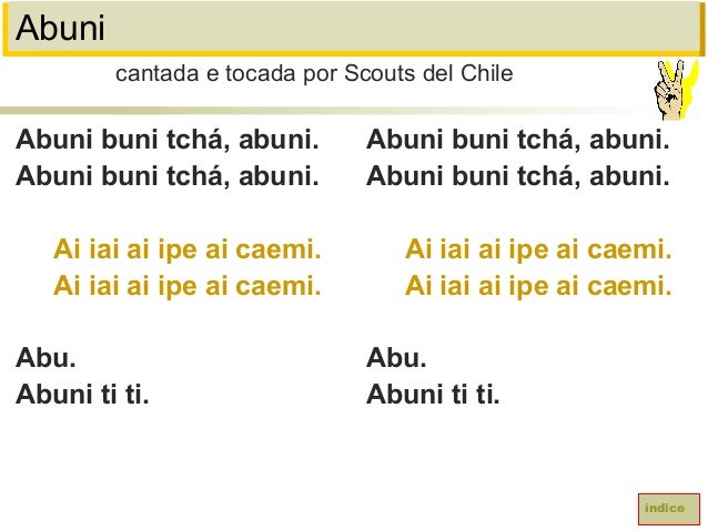 7. 7. AbuniAbuni buni tchá, abuni.Abuni buni tchá, abuni.Ai iai ai ipe ai caemi.Ai iai ai ipe ai caemi.Abu.Abuni ti ti.cantada e tocada por Scouts del ChileíndiceAbuni buni tchá, abuni.Abuni buni tchá, abuni.Ai iai ai ipe ai caemi.Ai iai ai ipe ai caemi.Abu.Abuni ti ti.