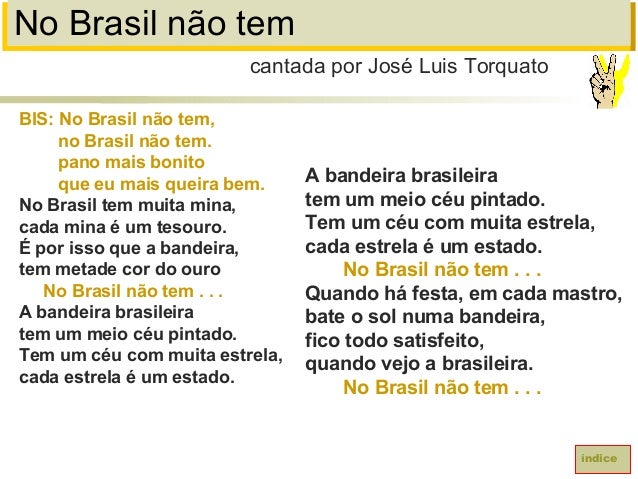70. 70. No Brasil não temBIS: No Brasil não tem,no Brasil não tem.pano mais bonitoque eu mais queira bem.No Brasil tem muita mina,cada mina é um tesouro.É por isso que a bandeira,tem metade cor do ouroNo Brasil não tem . . .A bandeira brasileiratem um meio céu pintado.Tem um céu com muita estrela,cada estrela é um estado.cantada por José Luis TorquatoíndiceA bandeira brasileiratem um meio céu pintado.Tem um céu com muita estrela,cada estrela é um estado.No Brasil não tem . . .Quando há festa, em cada mastro,bate o sol numa bandeira,fico todo satisfeito,quando vejo a brasileira.No Brasil não tem . . .