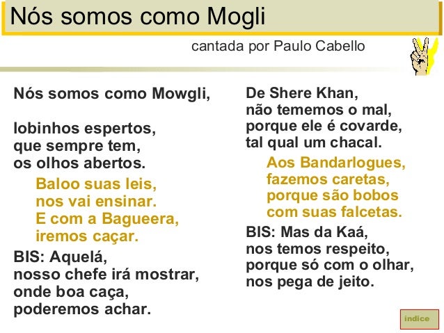 71. 71. Nós somos como MogliNós somos como Mowgli,lobinhos espertos,que sempre tem,os olhos abertos.Baloo suas leis,nos vai ensinar.E com a Bagueera,iremos caçar.BIS: Aquelá,nosso chefe irá mostrar,onde boa caça,poderemos achar.cantada por Paulo CabelloíndiceDe Shere Khan,não tememos o mal,porque ele é covarde,tal qual um chacal.Aos Bandarlogues,fazemos caretas,porque são boboscom suas falcetas.BIS: Mas da Kaá,nos temos respeito,porque só com o olhar,nos pega de jeito.
