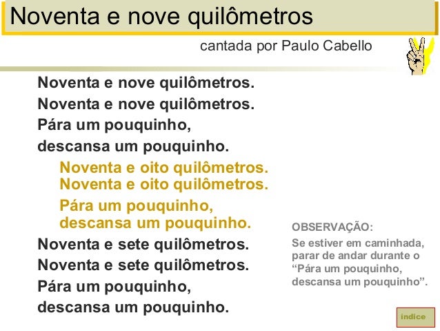 72. 72. Noventa e nove quilômetrosNoventa e nove quilômetros.Noventa e nove quilômetros.Pára um pouquinho,descansa um pouquinho.Noventa e oito quilômetros.Noventa e oito quilômetros.Pára um pouquinho,descansa um pouquinho.Noventa e sete quilômetros.Noventa e sete quilômetros.Pára um pouquinho,descansa um pouquinho.cantada por Paulo CabelloíndiceOBSERVAÇÃO:Se estiver em caminhada,parar de andar durante o“Pára um pouquinho,descansa um pouquinho”.