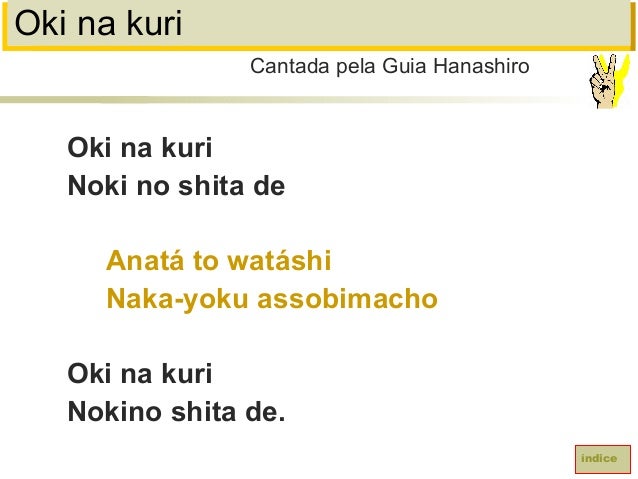 73. 73. Oki na kuriOki na kuriNoki no shita deAnatá to watáshiNaka-yoku assobimachoOki na kuriNokino shita de.Cantada pela Guia Hanashiroíndice