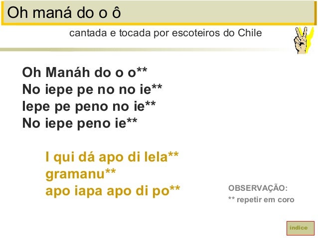74. 74. Oh maná do o ôOh Manáh do o o**No iepe pe no no ie**Iepe pe peno no ie**No iepe peno ie**I qui dá apo di lela**gramanu**apo iapa apo di po**cantada e tocada por escoteiros do ChileíndiceOBSERVAÇÃO:** repetir em coro