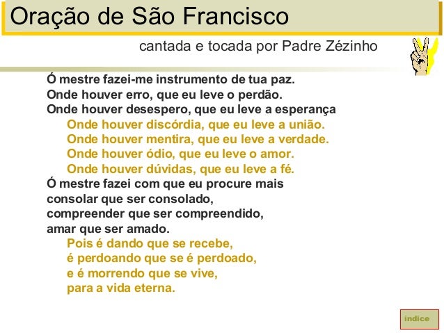 77. 77. Oração de São FranciscoÓ mestre fazei-me instrumento de tua paz.Onde houver erro, que eu leve o perdão.Onde houver desespero, que eu leve a esperançaOnde houver discórdia, que eu leve a união.Onde houver mentira, que eu leve a verdade.Onde houver ódio, que eu leve o amor.Onde houver dúvidas, que eu leve a fé.Ó mestre fazei com que eu procure maisconsolar que ser consolado,compreender que ser compreendido,amar que ser amado.Pois é dando que se recebe,é perdoando que se é perdoado,e é morrendo que se vive,para a vida eterna.cantada e tocada por Padre Zézinhoíndice