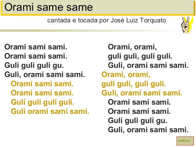 78. 78. Orami same sameOrami sami sami.Orami sami sami.Guli guli guli gu.Guli, orami sami sami.Orami sami sami.Orami sami sami.Guli guli guli guli.Guli orami sami sami.cantada e tocada por José Luiz TorquatoíndiceOrami, orami,guli guli, guli guli.Guli, orami sami sami.Orami, orami,guli guli, guli guli.Guli, orami sami sami.Orami sami sami.Orami sami sami.Guli guli guli gu.Guli, orami sami sami.