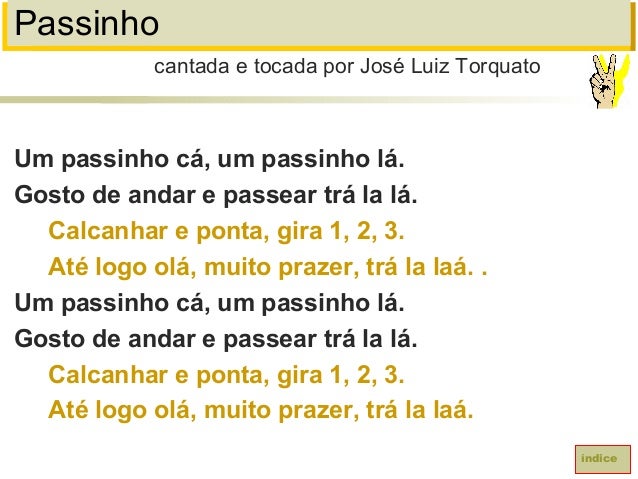 79. 79. PassinhoUm passinho cá, um passinho lá.Gosto de andar e passear trá la lá.Calcanhar e ponta, gira 1, 2, 3.Até logo olá, muito prazer, trá la laá. .Um passinho cá, um passinho lá.Gosto de andar e passear trá la lá.Calcanhar e ponta, gira 1, 2, 3.Até logo olá, muito prazer, trá la laá.cantada e tocada por José Luiz Torquatoíndice