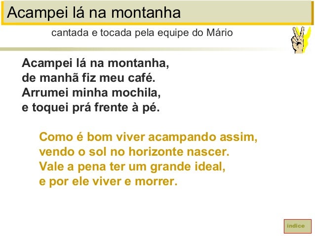 8. 8. Acampei lá na montanhaAcampei lá na montanha,de manhã fiz meu café.Arrumei minha mochila,e toquei prá frente à pé.Como é bom viver acampando assim,vendo o sol no horizonte nascer.Vale a pena ter um grande ideal,e por ele viver e morrer.cantada e tocada pela equipe do Márioíndice