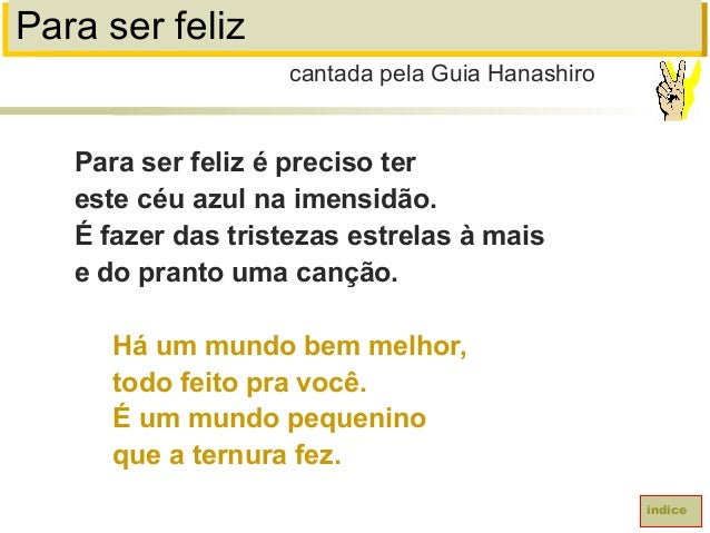 80. 80. Para ser felizPara ser feliz é preciso tereste céu azul na imensidão.É fazer das tristezas estrelas à maise do pranto uma canção.Há um mundo bem melhor,todo feito pra você.É um mundo pequeninoque a ternura fez.cantada pela Guia Hanashiroíndice
