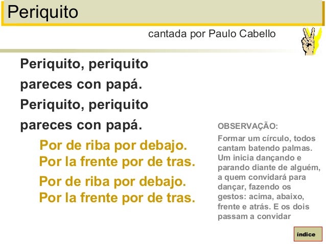 82. 82. PeriquitoPeriquito, periquitopareces con papá.Periquito, periquitopareces con papá.Por de riba por debajo.Por la frente por de tras.Por de riba por debajo.Por la frente por de tras.cantada por Paulo CabelloíndiceOBSERVAÇÃO:Formar um círculo, todoscantam batendo palmas.Um inicia dançando eparando diante de alguém,a quem convidará paradançar, fazendo osgestos: acima, abaixo,frente e atrás. E os doispassam a convidar