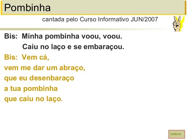 86. 86. PombinhaBis: Minha pombinha voou, voou.Caiu no laço e se embaraçou.Bis: Vem cá,vem me dar um abraço,que eu desenbaraçoa tua pombinhaque caiu no laço.cantada pelo Curso Informativo JUN/2007índice
