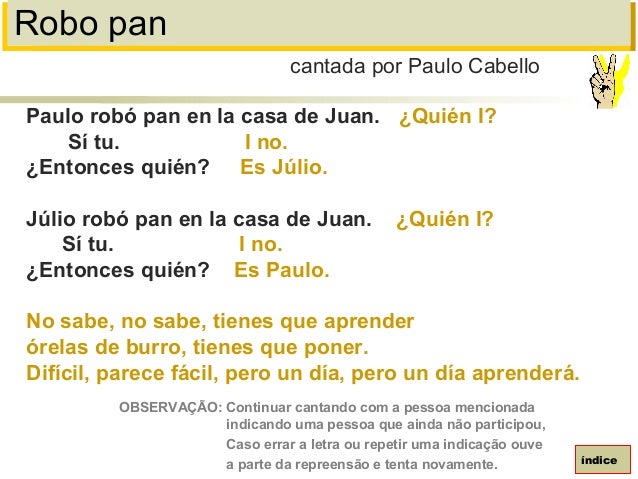 88. 88. Robo panPaulo robó pan en la casa de Juan. ¿Quién I?Sí tu. I no.¿Entonces quién? Es Júlio.Júlio robó pan en la casa de Juan. ¿Quién I?Sí tu. I no.¿Entonces quién? Es Paulo.No sabe, no sabe, tienes que aprenderórelas de burro, tienes que poner.Difícil, parece fácil, pero un día, pero un día aprenderá.cantada por Paulo CabelloíndiceOBSERVAÇÃO: Continuar cantando com a pessoa mencionadaindicando uma pessoa que ainda não participou,Caso errar a letra ou repetir uma indicação ouvea parte da repreensão e tenta novamente.