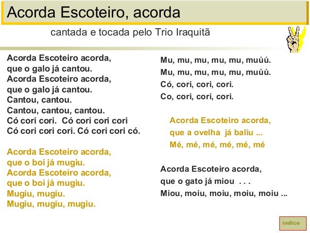 9. 9. Acorda Escoteiro, acordaAcorda Escoteiro acorda,que o galo já cantou.Acorda Escoteiro acorda,que o galo já cantou.Cantou, cantou.Cantou, cantou, cantou.Có cori cori. Có cori cori coriCó cori cori cori. Có cori cori có.Acorda Escoteiro acorda,que o boi já mugiu.Acorda Escoteiro acorda,que o boi já mugiu.Mugiu, mugiu.Mugiu, mugiu, mugiu.cantada e tocada pelo Trio IraquitãíndiceMu, mu, mu, mu, mu, muúú.Mu, mu, mu, mu, mu, muúú.Có, cori, cori, cori.Co, cori, cori, cori.Acorda Escoteiro acorda,que a ovelha já baliu ...Mé, mé, mé, mé, mé, méAcorda Escoteiro acorda,que o gato já miou . . .Miou, moiu, moiu, moiu, moiu ...