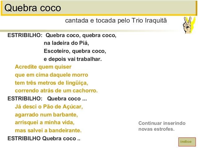90. 90. Quebra cocoESTRIBILHO: Quebra coco, quebra coco,na ladeira do Piá,Escoteiro, quebra coco,e depois vai trabalhar.Acredite quem quiserque em cima daquele morrotem três metros de lingüiça,correndo atrás de um cachorro.ESTRIBILHO: Quebra coco ...Já desci o Pão de Açúcar,agarrado num barbante,arrisquei a minha vida,mas salvei a bandeirante.ESTRIBILHO Quebra coco ..cantada e tocada pelo Trio IraquitãíndiceContinuar inserindonovas estrofes.