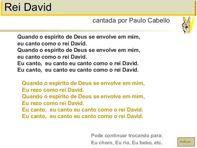 92. 92. Rei DavidQuando o espírito de Deus se envolve em mim,eu canto como o rei David.Quando o espírito de Deus se envolve em mim,eu canto como o rei David.Eu canto, eu canto eu canto como o rei David.Eu canto, eu canto eu canto como o rei David.Quando o espírito de Deus se envolve em mim,Eu rezo como rei David.Quando o espírito de Deus se envolve em mim,Eu rezo como rei David.Eu canto, eu canto eu canto como o rei David.Eu canto, eu canto eu canto como o rei David.cantada por Paulo CabelloíndicePode continuar trocando para:Eu choro, Eu rio, Eu bebo, etc.