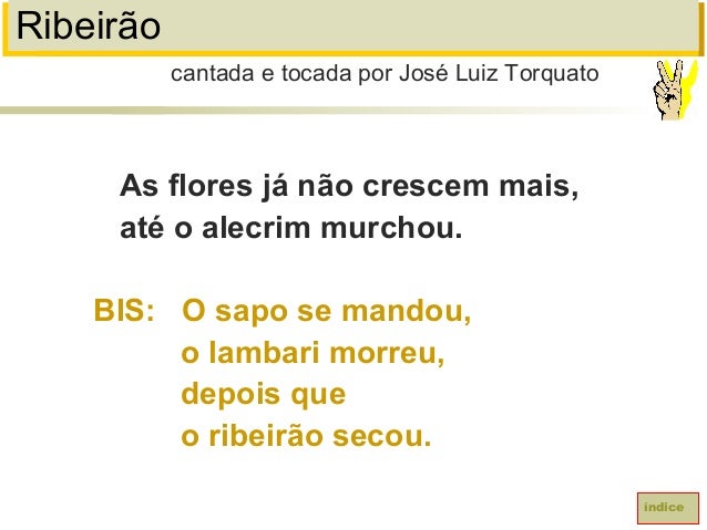 93. 93. RibeirãoAs flores já não crescem mais,até o alecrim murchou.BIS: O sapo se mandou,o lambari morreu,depois queo ribeirão secou.cantada e tocada por José Luiz Torquatoíndice