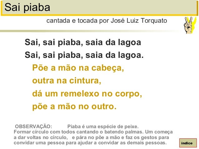94. 94. Sai piabaSai, sai piaba, saia da lagoaSai, sai piaba, saia da lagoa.Põe a mão na cabeça,outra na cintura,dá um remelexo no corpo,põe a mão no outro.cantada e tocada por José Luiz TorquatoíndiceOBSERVAÇÃO: Piaba é uma espécie de peixe.Formar círculo com todos cantando o batendo palmas. Um começaa dar voltas no círculo, e pára no põe a mão e faz os gestos paraconvidar uma pessoa para ajudar a convidar as demais pessoas.