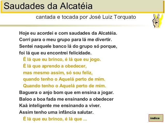 96. 96. Saudades da AlcatéiaHoje eu acordei e com saudades da Alcatéia.Corri para o meu grupo para lá me divertir.Sentei naquele banco lá do grupo só porque,foi lá que eu encontrei felicidade.É lá que eu brinco, é lá que eu jogo.É lá que aprendo a obedecer,mas mesmo assim, só sou feliz,quando tenho o Aquelá perto de mim.Quando tenho o Aquelá perto de mim.Baguera o anjo bom que em ensina a jogar.Baloo a boa fada me ensinando a obedecerKaá inteligente me ensinando a viver.Assim tenho uma infância salutar.É lá que eu brinco, é lá que ...cantada e tocada por José Luiz Torquatoíndice