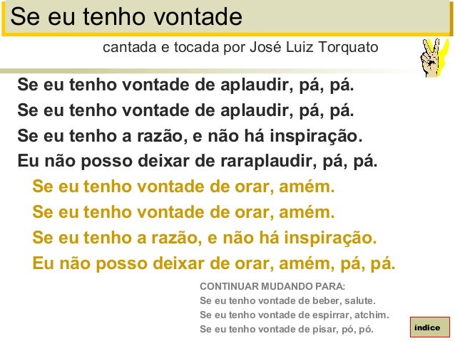 97. 97. Se eu tenho vontadeSe eu tenho vontade de aplaudir, pá, pá.Se eu tenho vontade de aplaudir, pá, pá.Se eu tenho a razão, e não há inspiração.Eu não posso deixar de raraplaudir, pá, pá.Se eu tenho vontade de orar, amém.Se eu tenho vontade de orar, amém.Se eu tenho a razão, e não há inspiração.Eu não posso deixar de orar, amém, pá, pá.cantada e tocada por José Luiz TorquatoíndiceCONTINUAR MUDANDO PARA:Se eu tenho vontade de beber, salute.Se eu tenho vontade de espirrar, atchim.Se eu tenho vontade de pisar, pó, pó.