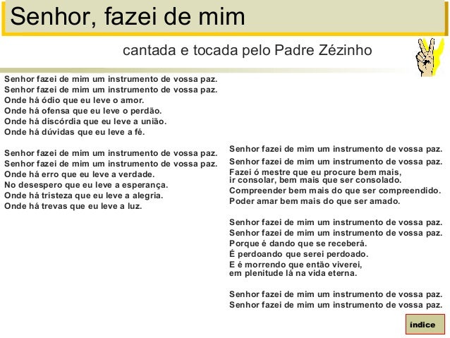 98. 98. Senhor, fazei de mimSenhor fazei de mim um instrumento de vossa paz.Senhor fazei de mim um instrumento de vossa paz.Onde há ódio que eu leve o amor.Onde há ofensa que eu leve o perdão.Onde há discórdia que eu leve a união.Onde há dúvidas que eu leve a fé.Senhor fazei de mim um instrumento de vossa paz.Senhor fazei de mim um instrumento de vossa paz.Onde há erro que eu leve a verdade.No desespero que eu leve a esperança.Onde há tristeza que eu leve a alegria.Onde há trevas que eu leve a luz.cantada e tocada pelo Padre ZézinhoíndiceSenhor fazei de mim um instrumento de vossa paz.Senhor fazei de mim um instrumento de vossa paz.Fazei ó mestre que eu procure bem mais,ir consolar, bem mais que ser consolado.Compreender bem mais do que ser compreendido.Poder amar bem mais do que ser amado.Senhor fazei de mim um instrumento de vossa paz.Senhor fazei de mim um instrumento de vossa paz.Porque é dando que se receberá.É perdoando que serei perdoado.E é morrendo que então viverei,em plenitude lá na vida eterna.Senhor fazei de mim um instrumento de vossa paz.Senhor fazei de mim um instrumento de vossa paz.