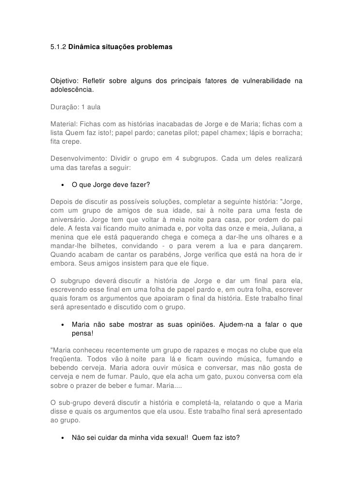10. 10. 5.1.2 Dinâmica situações problemas  Objetivo:   Refletir   sobre   alguns   dos   principais   fatores   de   vulnerabilidade   na adolescência. Duração: 1 aula Material: Fichas com as histórias inacabadas de Jorge e de Maria; fichas com a lista Quem faz isto!; papel pardo; canetas pilot; papel chamex; lápis e borracha; fita crepe. Desenvolvimento: Dividir o grupo em 4 subgrupos. Cada um deles realizará uma das tarefas a seguir:  • O que Jorge deve fazer? Depois de discutir as possíveis soluções, completar a seguinte história: "Jorge, com   um   grupo   de   amigos   de   sua   idade,   sai   à   noite   para   uma   festa   de aniversário. Jorge tem que voltar à meia noite para casa, por ordem do pai dele. A festa vai ficando muito animada e, por volta das onze e meia, Juliana, a menina que ele está paquerando chega e começa a dar­lhe uns olhares e a mandar­lhe   bilhetes,   convidando   ­   o   para   verem   a   lua   e   para   dançarem. Quando acabam de cantar os parabéns, Jorge verifica que está na hora de ir embora. Seus amigos insistem para que ele fique. O   subgrupo   deverá discutir   a   história   de   Jorge   e   dar   um   final   para   ela, escrevendo esse final em uma folha de papel pardo e, em outra folha, escrever quais foram os argumentos que apoiaram o final da história. Este trabalho final será apresentado e discutido com o grupo.  • Maria   não   sabe   mostrar   as   suas   opiniões.   Ajudem­na   a   falar   o   que  pensa! "Maria conheceu recentemente um grupo de rapazes e moças no clube que ela freqüenta.   Todos   vão à noite   para   lá e   ficam   ouvindo   música,   fumando   e bebendo  cerveja.  Maria  adora   ouvir música   e  conversar,  mas  não  gosta  de cerveja e nem de fumar. Paulo, que ela acha um gato, puxou conversa com ela sobre o prazer de beber e fumar. Maria.... O sub­grupo deverá discutir a história e completá­la, relatando o que a Maria disse e quais os argumentos que ela usou. Este trabalho final será apresentado ao grupo.  • Não sei cuidar da minha vida sexual!  Quem faz isto?