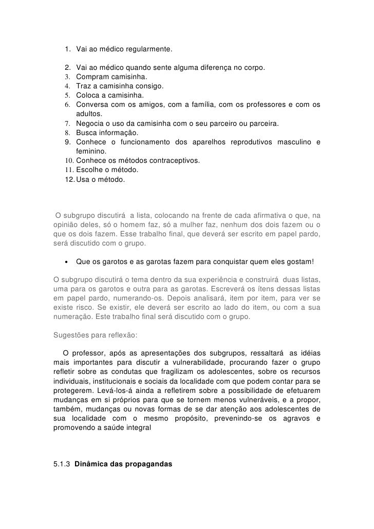 11. 11. 1. Vai ao médico regularmente.  2. Vai ao médico quando sente alguma diferença no corpo.  3. Compram camisinha.  4. Traz a camisinha consigo.  5. Coloca a camisinha.  6. Conversa com os amigos, com a família, com os professores e com os  adultos.  7. Negocia o uso da camisinha com o seu parceiro ou parceira.  8. Busca informação.  9. Conhece   o   funcionamento   dos   aparelhos   reprodutivos   masculino   e  feminino.  10. Conhece os métodos contraceptivos.  11. Escolhe o método.  12. Usa o método.    O subgrupo discutirá  a lista, colocando na frente de cada afirmativa o que, na opinião deles, só o homem faz, só a mulher faz, nenhum dos dois fazem ou o que os dois fazem. Esse trabalho final, que deverá ser escrito em papel pardo, será discutido com o grupo.  • Que os garotos e as garotas fazem para conquistar quem eles gostam! O subgrupo discutirá o tema dentro da sua experiência e construirá  duas listas, uma para os garotos e outra para as garotas. Escreverá os ítens dessas listas em papel pardo, numerando­os. Depois analisará, item por item, para ver se existe risco. Se existir, ele deverá ser escrito ao lado do item, ou com a sua numeração. Este trabalho final será discutido com o grupo. Sugestões para reflexão:     O professor, após  as apresentações dos  subgrupos, ressaltará   as  idéias mais   importantes   para   discutir   a   vulnerabilidade,   procurando   fazer   o   grupo refletir sobre as condutas que fragilizam os adolescentes, sobre os recursos individuais, institucionais e sociais da localidade com que podem contar para se protegerem. Levá­los­á ainda a refletirem sobre a possibilidade de efetuarem mudanças em si próprios para que se tornem menos vulneráveis, e a propor, também, mudanças ou novas formas de se dar atenção aos adolescentes de sua   localidade   com   o   mesmo   propósito,   prevenindo­se   os   agravos   e promovendo a saúde integral 5.1.3  Dinâmica das propagandas