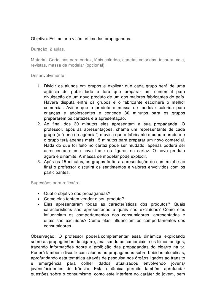 12. 12.  Objetivo: Estimular a visão crítica das propagandas. Duração: 2 aulas. Material: Cartolinas para cartaz, lápis colorido, canetas coloridas, tesoura, cola, revistas, massa de modelar (opcional). Desenvolvimento:  1. Dividir  os  alunos  em  grupos  e  explicar  que   cada   grupo   será   de   uma  agência   de   publicidade   e   terá   que   preparar   um   comercial   para  divulgação de um novo produto de um dos maiores fabricantes do país.  Haverá   disputa   entre   os   grupos   e   o   fabricante   escolherá   o   melhor  comercial.   Avisar   que   o   produto   é   massa   de   modelar   colorida   para  crianças   e   adolescentes   e   concede   30   minutos   para   os   grupos  prepararem os cartazes e a apresentação.  2. Ao   final   dos   30   minutos   eles   apresentam   a   sua   propaganda.   O  professor,   após   as   apresentações,   chama   um   representante   de   cada  grupo (o "dono da agência") e avisa que o fabricante mudou o produto e  o grupo terá apenas mais 15 minutos para preparar um novo comercial.  Nada do que foi feito no cartaz pode ser mudado, apenas poderá ser  acrescentada   uma   nova   frase   ou   figuras   no   cartaz.   O   novo   produto  agora é dinamite. A massa de modelar pode explodir.  3. Após os 15 minutos, os grupos farão a apresentação do comercial e ao  final o professor discutirá os sentimentos e valores envolvidos com os  participantes. Sugestões para reflexão:  • Qual o objetivo das propagandas?  • Como elas tentam vender o seu produto?  • Elas   apresentaram   todas   as   características   dos   produtos?   Quais  características   são   apresentadas   e   quais   são   excluídas?   Como   elas  influenciam   os   comportamentos   dos   consumidores.   apresentadas   e  quais   são   excluídas?   Como   elas   influenciam   os   comportamentos   dos  consumidores. Observação:   O   professor   poderá complementar   essa   dinâmica   explicando sobre as propagandas do cigarro, analisando os comerciais e os filmes antigos, trazendo   informações   sobre   a   proibição   das   propagandas   do   cigarro   na   tv. Poderá também discutir com alunos as propagandas sobre bebidas alcoólicas, aprofundando esta temática através de pesquisa nos órgãos ligados ao transito e   emergência   para   colher   dados   atualizados   envolvendo   jovens/ jovens/acidentes   de   trânsito.   Esta   dinâmica   permite   também   aprofundar questões sobre o consumismo, como este interfere no caráter do jovem, bem