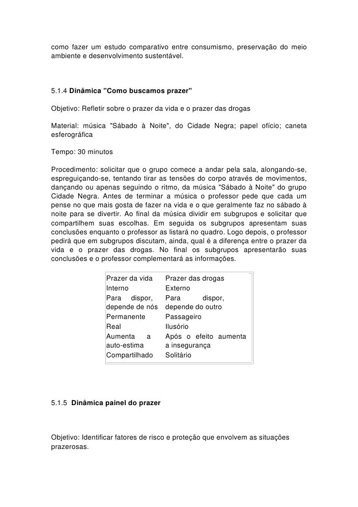13. 13. como fazer um estudo comparativo entre consumismo, preservação do meio ambiente e desenvolvimento sustentável. 5.1.4 Dinâmica "Como buscamos prazer"Objetivo: Refletir sobre o prazer da vida e o prazer das drogasMaterial:   música   "Sábado   à   Noite",   do   Cidade   Negra;   papel   ofício;   caneta esferográficaTempo: 30 minutosProcedimento: solicitar que o grupo comece a andar pela sala, alongando­se, espreguiçando­se, tentando tirar as tensões do corpo através de movimentos, dançando ou apenas seguindo o ritmo, da música "Sábado à Noite" do grupo Cidade   Negra.   Antes   de   terminar   a   música   o   professor   pede   que   cada   um pense no que mais gosta de fazer na vida e o que geralmente faz no sábado à noite para se divertir. Ao final da música dividir em subgrupos e solicitar que compartilhem   suas   escolhas.   Em   seguida   os   subgrupos   apresentam   suas conclusões enquanto o professor as listará no quadro. Logo depois, o professor pedirá que em subgrupos discutam, ainda, qual é a diferença entre o prazer da vida   e   o   prazer   das   drogas.   No   final   os   subgrupos   apresentarão   suas conclusões e o professor complementará as informações. Prazer da vida Prazer das drogas Interno Externo Para   dispor,    Para   dispor,    depende de nós depende do outro Permanente Passageiro Real Ilusório Aumenta   a    Após   o   efeito   aumenta  auto­estima a insegurança Compartilhado Solitário   5.1.5  Dinâmica painel do prazer Objetivo: Identificar fatores de risco e proteção que envolvem as situações prazerosas.