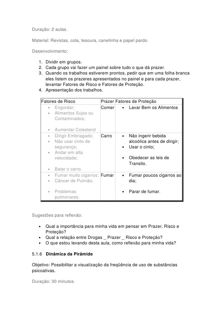 14. 14. Duração: 2 aulas.Material: Revistas, cola, tesoura, canetinha e papel pardo.Desenvolvimento: 1. Dividir em grupos.  2. Cada grupo vai fazer um painel sobre tudo o que dá prazer.  3. Quando os trabalhos estiverem prontos, pedir que em uma folha branca  eles listem os prazeres apresentados no painel e para cada prazer,  levantar Fatores de Risco e Fatores de Proteção.  4. Apresentação dos trabalhos.  Fatores de Risco Prazer Fatores de Proteção • Engordar;  Comer • Lavar Bem os Alimentos  • Alimentos Sujos ou  Contaminados;  • Aumentar Colesterol  • Dirigir Embriagado;  Carro • Não ingerir bebida  • Não usar cinto de  alcoólica antes de dirigir;  segurança;  • Usar o cinto;  • Andar em alta  velocidade;  • Obedecer as leis de  Transito.  • Bater o carro.  • Fumar muito cigarros;  Fumar • Fumar poucos cigarros ao  • Câncer de Pulmão;  dia;  • Problemas  • Parar de fumar.  pulmonares.    Sugestões para reflexão: • Qual a importância para minha vida em pensar em Prazer, Risco e  Proteção?  • Qual a relação entre Drogas _ Prazer _ Risco e Proteção?  • O que estou levando desta aula, como reflexão para minha vida? 5.1.6   Dinâmica da PirâmideObjetivo: Possibilitar a visualização da freqüência de uso de substâncias psicoativas. Duração: 30 minutos.