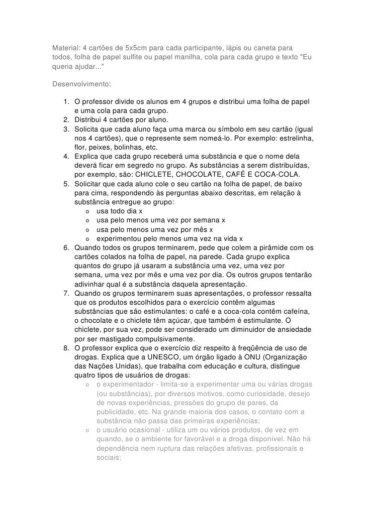 15. 15. Material: 4 cartões de 5x5cm para cada participante, lápis ou caneta para todos, folha de papel sulfite ou papel manilha, cola para cada grupo e texto "Eu queria ajudar..."Desenvolvimento: 1. O professor divide os alunos em 4 grupos e distribui uma folha de papel  e uma cola para cada grupo.  2. Distribui 4 cartões por aluno.  3. Solicita que cada aluno faça uma marca ou símbolo em seu cartão (igual  nos 4 cartões), que o represente sem nomeá­lo. Por exemplo: estrelinha,  flor, peixes, bolinhas, etc.  4. Explica que cada grupo receberá uma substância e que o nome dela  deverá ficar em segredo no grupo. As substâncias a serem distribuídas,  por exemplo, são: CHICLETE, CHOCOLATE, CAFÉ E COCA­COLA.  5. Solicitar que cada aluno cole o seu cartão na folha de papel, de baixo  para cima, respondendo às perguntas abaixo descritas, em relação à  substância entregue ao grupo:  o usa todo dia x  o usa pelo menos uma vez por semana x  o usa pelo menos uma vez por mês x  o experimentou pelo menos uma vez na vida x  6. Quando todos os grupos terminarem, pede que colem a pirâmide com os  cartões colados na folha de papel, na parede. Cada grupo explica  quantos do grupo já usaram a substância uma vez, uma vez por  semana, uma vez por mês e uma vez por dia. Os outros grupos tentarão  adivinhar qual é a substância daquela apresentação.  7. Quando os grupos terminarem suas apresentações, o professor ressalta  que os produtos escolhidos para o exercício contêm algumas  substâncias que são estimulantes: o café e a coca­cola contêm cafeína,  o chocolate e o chiclete têm açúcar, que também é estimulante. O  chiclete, por sua vez, pode ser considerado um diminuidor de ansiedade  por ser mastigado compulsivamente.  8. O professor explica que o exercício diz respeito à freqüência de uso de  drogas. Explica que a UNESCO, um órgão ligado à ONU (Organização  das Nações Unidas), que trabalha com educação e cultura, distingue  quatro tipos de usuários de drogas:  o o experimentador ­ limita­se a experimentar uma ou várias drogas  (ou substâncias), por diversos motivos, como curiosidade, desejo  de novas experiências, pressões do grupo de pares, da  publicidade, etc. Na grande maioria dos casos, o contato com a  substância não passa das primeiras experiências;  o o usuário ocasional ­ utiliza um ou vários produtos, de vez em  quando, se o ambiente for favorável e a droga disponível. Não há  dependência nem ruptura das relações afetivas, profissionais e  sociais;