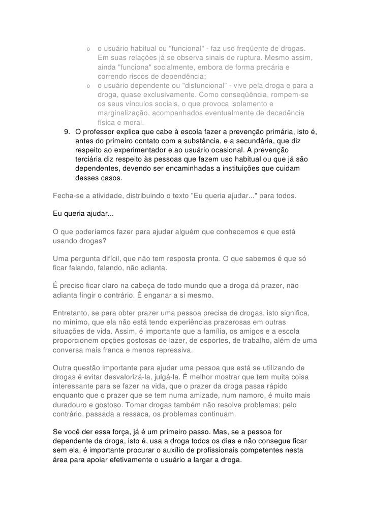 16. 16. o o usuário habitual ou "funcional" ­ faz uso freqüente de drogas.  Em suas relações já se observa sinais de ruptura. Mesmo assim,  ainda "funciona" socialmente, embora de forma precária e  correndo riscos de dependência;  o o usuário dependente ou "disfuncional" ­ vive pela droga e para a  droga, quase exclusivamente. Como conseqüência, rompem­se  os seus vínculos sociais, o que provoca isolamento e  marginalização, acompanhados eventualmente de decadência  física e moral.  9. O professor explica que cabe à escola fazer a prevenção primária, isto é,  antes do primeiro contato com a substância, e a secundária, que diz  respeito ao experimentador e ao usuário ocasional. A prevenção  terciária diz respeito às pessoas que fazem uso habitual ou que já são  dependentes, devendo ser encaminhadas a instituições que cuidam  desses casos. Fecha­se a atividade, distribuindo o texto "Eu queria ajudar..." para todos.Eu queria ajudar...O que poderíamos fazer para ajudar alguém que conhecemos e que está usando drogas?Uma pergunta difícil, que não tem resposta pronta. O que sabemos é que só  ficar falando, falando, não adianta.É preciso ficar claro na cabeça de todo mundo que a droga dá prazer, não adianta fingir o contrário. É enganar a si mesmo.Entretanto, se para obter prazer uma pessoa precisa de drogas, isto significa, no mínimo, que ela não está tendo experiências prazerosas em outras situações de vida. Assim, é importante que a família, os amigos e a escola proporcionem opções gostosas de lazer, de esportes, de trabalho, além de uma conversa mais franca e menos repressiva.Outra questão importante para ajudar uma pessoa que está se utilizando de drogas é evitar desvalorizá­la, julgá­la. É melhor mostrar que tem muita coisa interessante para se fazer na vida, que o prazer da droga passa rápido enquanto que o prazer que se tem numa amizade, num namoro, é muito mais duradouro e gostoso. Tomar drogas também não resolve problemas; pelo contrário, passada a ressaca, os problemas continuam.Se você der essa força, já é um primeiro passo. Mas, se a pessoa for dependente da droga, isto é, usa a droga todos os dias e não consegue ficar sem ela, é importante procurar o auxílio de profissionais competentes nesta área para apoiar efetivamente o usuário a largar a droga.