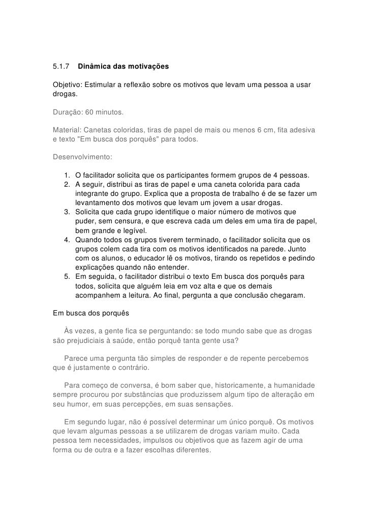 17. 17.  5.1.7    Dinâmica das motivaçõesObjetivo: Estimular a reflexão sobre os motivos que levam uma pessoa a usar drogas. Duração: 60 minutos.Material: Canetas coloridas, tiras de papel de mais ou menos 6 cm, fita adesiva e texto "Em busca dos porquês" para todos.Desenvolvimento: 1. O facilitador solicita que os participantes formem grupos de 4 pessoas.  2. A seguir, distribui as tiras de papel e uma caneta colorida para cada  integrante do grupo. Explica que a proposta de trabalho é de se fazer um  levantamento dos motivos que levam um jovem a usar drogas.  3. Solicita que cada grupo identifique o maior número de motivos que  puder, sem censura, e que escreva cada um deles em uma tira de papel,  bem grande e legível.  4. Quando todos os grupos tiverem terminado, o facilitador solicita que os  grupos colem cada tira com os motivos identificados na parede. Junto  com os alunos, o educador lê os motivos, tirando os repetidos e pedindo  explicações quando não entender.  5. Em seguida, o facilitador distribui o texto Em busca dos porquês para  todos, solicita que alguém leia em voz alta e que os demais  acompanhem a leitura. Ao final, pergunta a que conclusão chegaram. Em busca dos porquês Às vezes, a gente fica se perguntando: se todo mundo sabe que as drogas são prejudiciais à saúde, então porquê tanta gente usa?   Parece uma pergunta tão simples de responder e de repente percebemos que é justamente o contrário. Para começo de conversa, é bom saber que, historicamente, a humanidade sempre procurou por substâncias que produzissem algum tipo de alteração em seu humor, em suas percepções, em suas sensações. Em segundo lugar, não é possível determinar um único porquê. Os motivos que levam algumas pessoas a se utilizarem de drogas variam muito. Cada pessoa tem necessidades, impulsos ou objetivos que as fazem agir de uma forma ou de outra e a fazer escolhas diferentes.