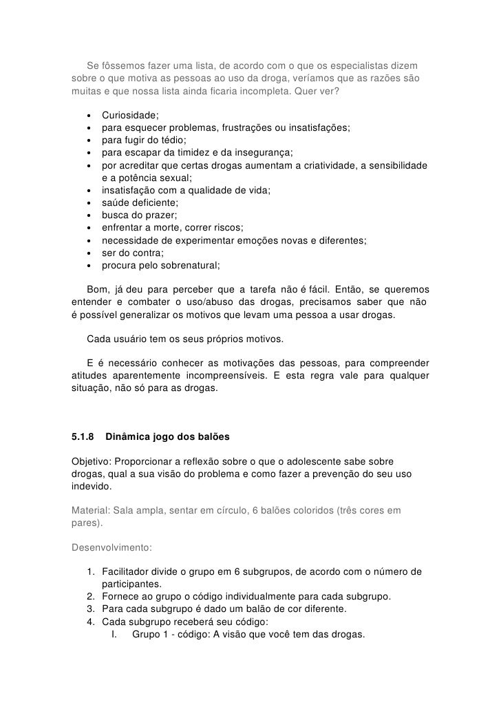 18. 18. Se fôssemos fazer uma lista, de acordo com o que os especialistas dizem sobre o que motiva as pessoas ao uso da droga, veríamos que as razões são muitas e que nossa lista ainda ficaria incompleta. Quer ver? • Curiosidade;  • para esquecer problemas, frustrações ou insatisfações;  • para fugir do tédio;  • para escapar da timidez e da insegurança;  • por acreditar que certas drogas aumentam a criatividade, a sensibilidade  e a potência sexual;  • insatisfação com a qualidade de vida;  • saúde deficiente;  • busca do prazer;  • enfrentar a morte, correr riscos;  • necessidade de experimentar emoções novas e diferentes;  • ser do contra;  • procura pelo sobrenatural;  Bom,  já deu   para   perceber  que   a   tarefa   não é fácil.   Então,   se   queremos entender   e   combater   o   uso/abuso   das   drogas,   precisamos   saber   que   não  é possível generalizar os motivos que levam uma pessoa a usar drogas. Cada usuário tem os seus próprios motivos.  E é necessário conhecer as motivações das pessoas, para compreender atitudes   aparentemente   incompreensíveis.   E   esta   regra   vale   para   qualquer situação, não só para as drogas. 5.1.8    Dinâmica jogo dos balõesObjetivo: Proporcionar a reflexão sobre o que o adolescente sabe sobre drogas, qual a sua visão do problema e como fazer a prevenção do seu uso indevido. Material: Sala ampla, sentar em círculo, 6 balões coloridos (três cores em pares).Desenvolvimento: 1. Facilitador divide o grupo em 6 subgrupos, de acordo com o número de  participantes.  2. Fornece ao grupo o código individualmente para cada subgrupo.  3. Para cada subgrupo é dado um balão de cor diferente.  4. Cada subgrupo receberá seu código:  I. Grupo 1 ­ código: A visão que você tem das drogas.