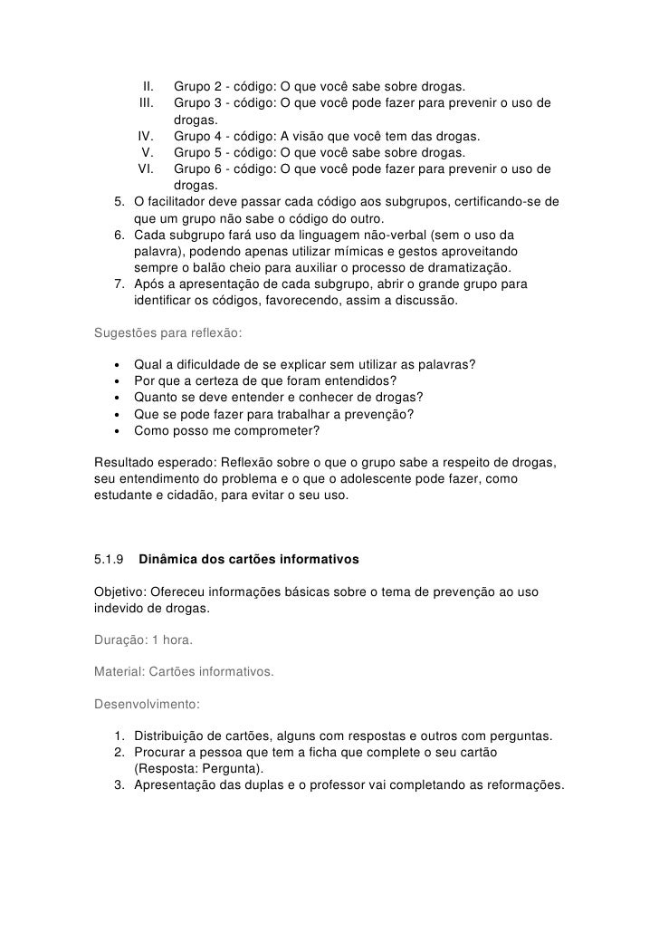 19. 19. II. Grupo 2 ­ código: O que você sabe sobre drogas.  III. Grupo 3 ­ código: O que você pode fazer para prevenir o uso de  drogas.  IV. Grupo 4 ­ código: A visão que você tem das drogas.  V. Grupo 5 ­ código: O que você sabe sobre drogas.  VI. Grupo 6 ­ código: O que você pode fazer para prevenir o uso de  drogas.  5. O facilitador deve passar cada código aos subgrupos, certificando­se de  que um grupo não sabe o código do outro.  6. Cada subgrupo fará uso da linguagem não­verbal (sem o uso da  palavra), podendo apenas utilizar mímicas e gestos aproveitando  sempre o balão cheio para auxiliar o processo de dramatização.  7. Após a apresentação de cada subgrupo, abrir o grande grupo para  identificar os códigos, favorecendo, assim a discussão. Sugestões para reflexão: • Qual a dificuldade de se explicar sem utilizar as palavras?  • Por que a certeza de que foram entendidos?  • Quanto se deve entender e conhecer de drogas?  • Que se pode fazer para trabalhar a prevenção?  • Como posso me comprometer? Resultado esperado: Reflexão sobre o que o grupo sabe a respeito de drogas, seu entendimento do problema e o que o adolescente pode fazer, como estudante e cidadão, para evitar o seu uso. 5.1.9    Dinâmica dos cartões informativosObjetivo: Ofereceu informações básicas sobre o tema de prevenção ao uso indevido de drogas. Duração: 1 hora.Material: Cartões informativos.Desenvolvimento: 1. Distribuição de cartões, alguns com respostas e outros com perguntas.  2. Procurar a pessoa que tem a ficha que complete o seu cartão  (Resposta: Pergunta).  3. Apresentação das duplas e o professor vai completando as reformações.