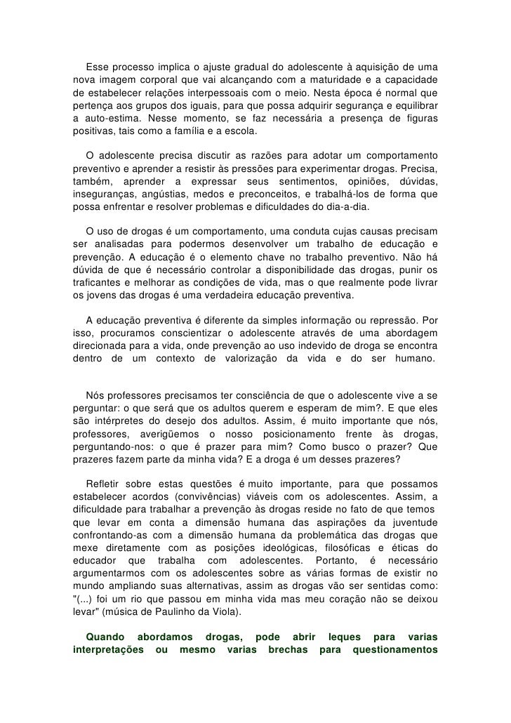 2. 2.      Esse processo implica o ajuste gradual do adolescente à aquisição de uma nova imagem corporal que vai alcançando com a maturidade e a capacidade de estabelecer relações interpessoais com o meio. Nesta época é normal que pertença aos grupos dos iguais, para que possa adquirir segurança e equilibrar a   auto­estima.   Nesse   momento,   se   faz   necessária   a   presença   de   figuras positivas, tais como a família e a escola.      O  adolescente   precisa   discutir   as  razões  para   adotar   um   comportamento preventivo e aprender a resistir às pressões para experimentar drogas. Precisa, também,   aprender   a   expressar   seus   sentimentos,   opiniões,   dúvidas, inseguranças, angústias, medos e preconceitos, e trabalhá­los de forma que possa enfrentar e resolver problemas e dificuldades do dia­a­dia.     O uso de drogas é um comportamento, uma conduta cujas causas precisam ser   analisadas   para   podermos   desenvolver   um   trabalho   de   educação   e prevenção. A educação é o elemento chave no trabalho preventivo. Não há dúvida de que é necessário controlar a disponibilidade das drogas, punir os traficantes e melhorar as condições de vida, mas o que realmente pode livrar os jovens das drogas é uma verdadeira educação preventiva.     A educação preventiva é diferente da simples informação ou repressão. Por isso,   procuramos   conscientizar   o   adolescente   através   de   uma   abordagem direcionada para a vida, onde prevenção ao uso indevido de droga se encontra dentro   de   um   contexto   de   valorização   da   vida   e   do   ser   humano.       Nós professores precisamos ter consciência de que o adolescente vive a se perguntar: o que será que os adultos querem e esperam de mim?. E que eles são   intérpretes   do   desejo   dos   adultos.   Assim,   é   muito   importante   que   nós, professores,   averigüemos   o   nosso   posicionamento   frente   às   drogas, perguntando­nos:   o   que   é   prazer   para   mim?   Como   busco   o   prazer?   Que prazeres fazem parte da minha vida? E a droga é um desses prazeres?      Refletir   sobre   estas   questões   é muito   importante,   para   que   possamos estabelecer   acordos   (convivências)   viáveis   com   os   adolescentes.   Assim,   a dificuldade para trabalhar a prevenção às drogas reside no fato de que temos  que   levar   em   conta   a   dimensão   humana   das   aspirações   da   juventude confrontando­as   com   a   dimensão   humana   da   problemática   das   drogas   que mexe   diretamente   com   as   posições   ideológicas,   filosóficas   e   éticas   do educador   que   trabalha   com   adolescentes.   Portanto,   é   necessário argumentarmos   com   os   adolescentes   sobre   as   várias   formas   de   existir   no mundo ampliando suas alternativas, assim as drogas vão ser sentidas como: "(...) foi um rio que passou em minha vida mas meu coração não se deixou levar" (música de Paulinho da Viola).     Quando   abordamos   drogas,   pode   abrir   leques   para   varias interpretações   ou   mesmo   varias   brechas   para   questionamentos