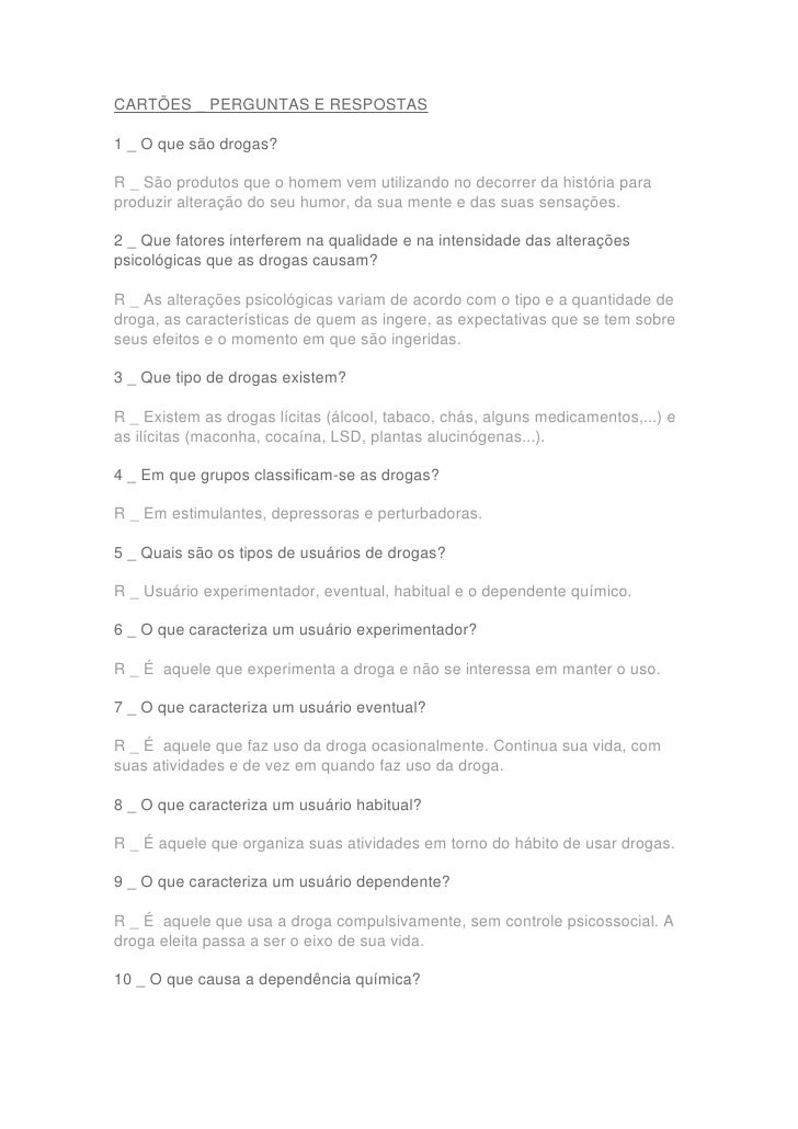 20. 20. CARTÕES _ PERGUNTAS E RESPOSTAS1 _ O que são drogas?R _ São produtos que o homem vem utilizando no decorrer da história para produzir alteração do seu humor, da sua mente e das suas sensações.2 _ Que fatores interferem na qualidade e na intensidade das alterações psicológicas que as drogas causam?R _ As alterações psicológicas variam de acordo com o tipo e a quantidade de droga, as características de quem as ingere, as expectativas que se tem sobre seus efeitos e o momento em que são ingeridas.3 _ Que tipo de drogas existem?R _ Existem as drogas lícitas (álcool, tabaco, chás, alguns medicamentos,...) e as ilícitas (maconha, cocaína, LSD, plantas alucinógenas...).4 _ Em que grupos classificam­se as drogas?R _ Em estimulantes, depressoras e perturbadoras.5 _ Quais são os tipos de usuários de drogas?R _ Usuário experimentador, eventual, habitual e o dependente químico.6 _ O que caracteriza um usuário experimentador?R _ É  aquele que experimenta a droga e não se interessa em manter o uso.7 _ O que caracteriza um usuário eventual?R _ É  aquele que faz uso da droga ocasionalmente. Continua sua vida, com suas atividades e de vez em quando faz uso da droga.8 _ O que caracteriza um usuário habitual?R _ É aquele que organiza suas atividades em torno do hábito de usar drogas.9 _ O que caracteriza um usuário dependente?R _ É  aquele que usa a droga compulsivamente, sem controle psicossocial. A droga eleita passa a ser o eixo de sua vida.10 _ O que causa a dependência química?