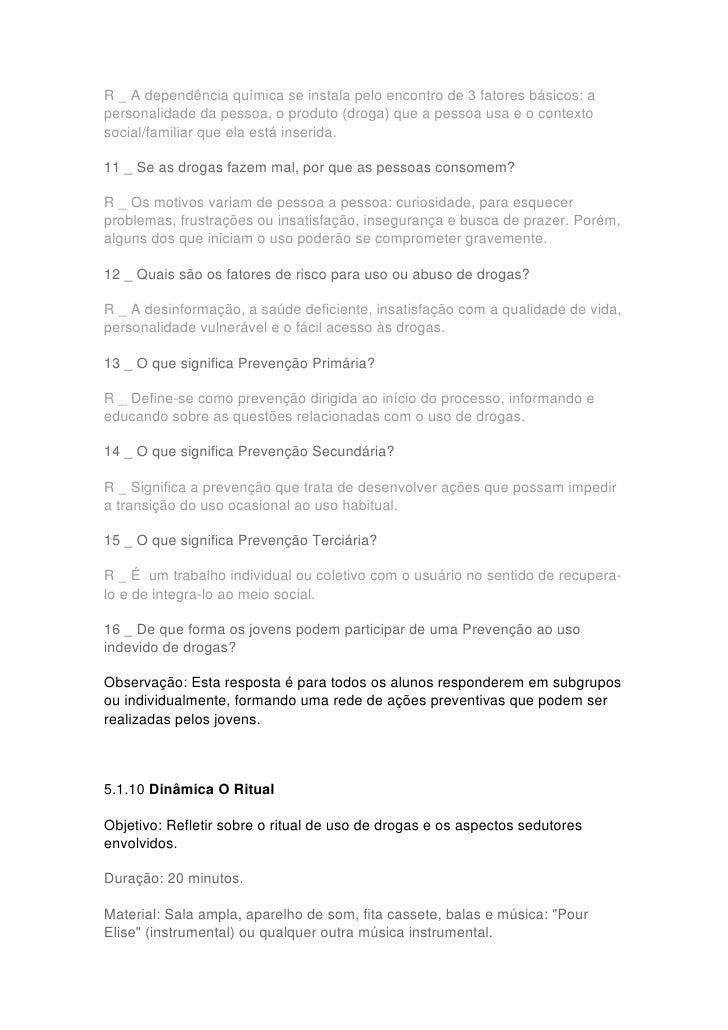 21. 21. R _ A dependência química se instala pelo encontro de 3 fatores básicos: a personalidade da pessoa, o produto (droga) que a pessoa usa e o contexto social/familiar que ela está inserida.11 _ Se as drogas fazem mal, por que as pessoas consomem?R _ Os motivos variam de pessoa a pessoa: curiosidade, para esquecer problemas, frustrações ou insatisfação, insegurança e busca de prazer. Porém, alguns dos que iniciam o uso poderão se comprometer gravemente.12 _ Quais são os fatores de risco para uso ou abuso de drogas?R _ A desinformação, a saúde deficiente, insatisfação com a qualidade de vida, personalidade vulnerável e o fácil acesso às drogas.13 _ O que significa Prevenção Primária?R _ Define­se como prevenção dirigida ao início do processo, informando e educando sobre as questões relacionadas com o uso de drogas.14 _ O que significa Prevenção Secundária?R _ Significa a prevenção que trata de desenvolver ações que possam impedir a transição do uso ocasional ao uso habitual.15 _ O que significa Prevenção Terciária?R _ É  um trabalho individual ou coletivo com o usuário no sentido de recupera­lo e de integra­lo ao meio social.16 _ De que forma os jovens podem participar de uma Prevenção ao uso indevido de drogas?Observação: Esta resposta é para todos os alunos responderem em subgrupos ou individualmente, formando uma rede de ações preventivas que podem ser realizadas pelos jovens. 5.1.10 Dinâmica O RitualObjetivo: Refletir sobre o ritual de uso de drogas e os aspectos sedutores envolvidos. Duração: 20 minutos.Material: Sala ampla, aparelho de som, fita cassete, balas e música: "Pour Elise" (instrumental) ou qualquer outra música instrumental.
