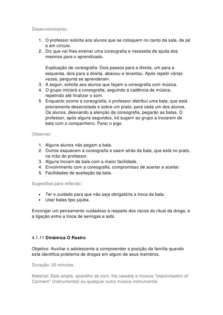 22. 22. Desenvolvimento: 1. O professor solicita aos alunos que se coloquem no canto da sala, de pé  e em círculo.  2. Diz que vai lhes ensinar uma coreografia e necessita de ajuda dos  mesmos para o aprendizado.    Explicação de coreografia: Dois passos para a direita, um para a  esquerda, dois para a direita, abaixou e levantou. Após repetir várias  vezes, pergunta se aprenderam.  3. A seguir, solicita aos alunos que façam a coreografia com música.  4. O grupo iniciará a coreografia, seguindo a cadência da música,  repetindo até finalizar o som.  5. Enquanto ocorre a coreografia, o professor distribui uma bala, que está  previamente desenrolada e sobre um prato, para cada um dos alunos.  Os alunos, desviando a atenção da coreografia, pegarão as balas. O  professor, após alguns segundos, irá sugerir ao grupo a trocarem de  bala com o companheiro. Parar o jogo. Observar: 1. Alguns alunos não pegam a bala.  2. Outros esquecem a coreografia e saem atrás da bala, que está no prato,  na mão do professor.  3. Alguns trocam de bala com a maior facilidade.  4. Envolvimento com a coreografia, compromisso de acertar e aceitar.  5. Facilidades de aceitação da bala. Sugestões para reflexão: • Ter o cuidado para que não seja obrigatória a troca de bala.  • Usar balas tipo jujuba. Encorajar um pensamento cuidadoso a respeito dos riscos do ritual da droga, e a ligação entre a troca de seringas e aids. 4.1.11 Dinâmica O RastroObjetivo: Auxiliar o adolescente a compreender a posição da família quando esta identifica problema de drogas em algum de seus membros. Duração: 20 minutos.Material: Sala ampla, aparelho de som, fita cassete e música "Improvisation of Carmem" (instrumental) ou qualquer outra música instrumental.